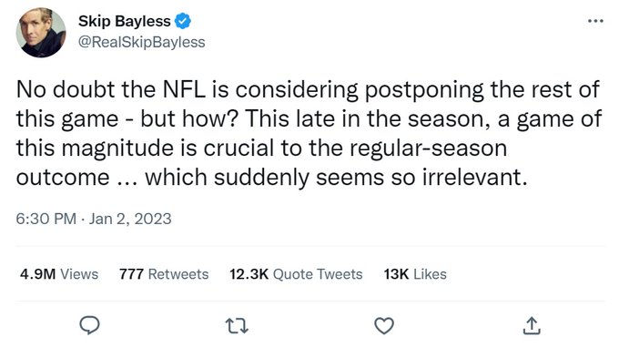 skip bayless tweets 2023 – Skip Bayless tweets about Damar Hamlin anger NFL players and analysts. Shannon Sharpe Returns To ‘Undisputed,’ Confronts Skip Bayless . Skip Bayless tweets about Damar Hamlin anger NFL players and analysts. Shannon Sharpe Skipped FS1 Show Over Skip Bayless’ Damar Hamlin Tweet. Skip Bayless tweets about Damar Hamlin anger NFL players and analysts. Skip Bayless Apologizes After Tweet on Bills Safety Damar Hamlin’s . Skip Bayless was asked ‘What in the actual the F are you thinking?’. Michael Strahan appears to rip Skip Bayless over Damar Hamlin tweet. Shannon Sharpe Tears Into Skip Bayless Over Damar Hamlin Tweets .
